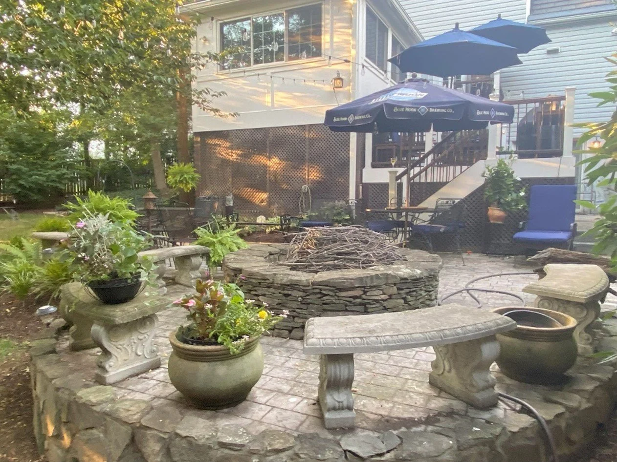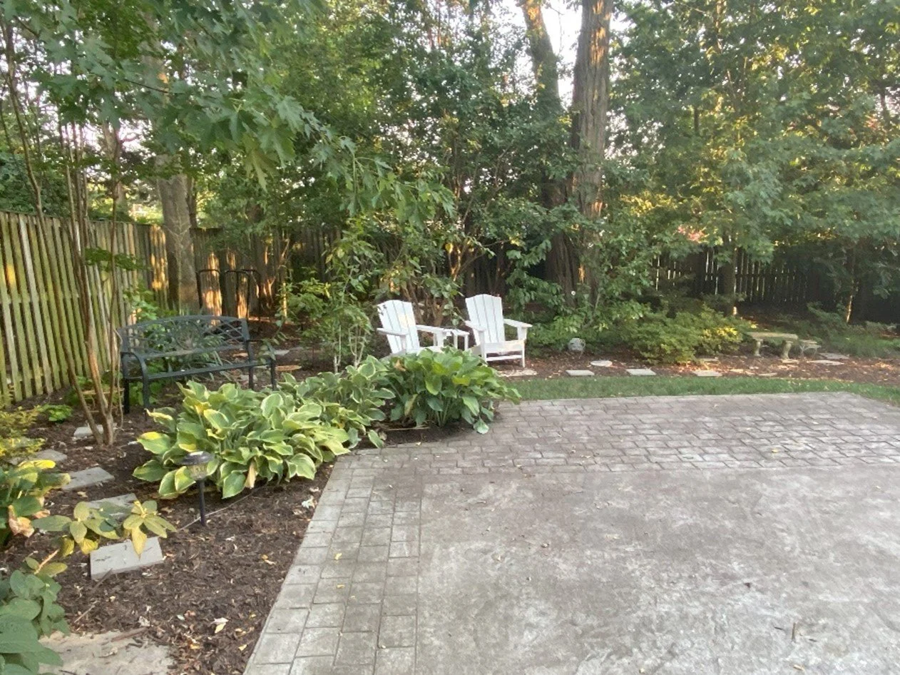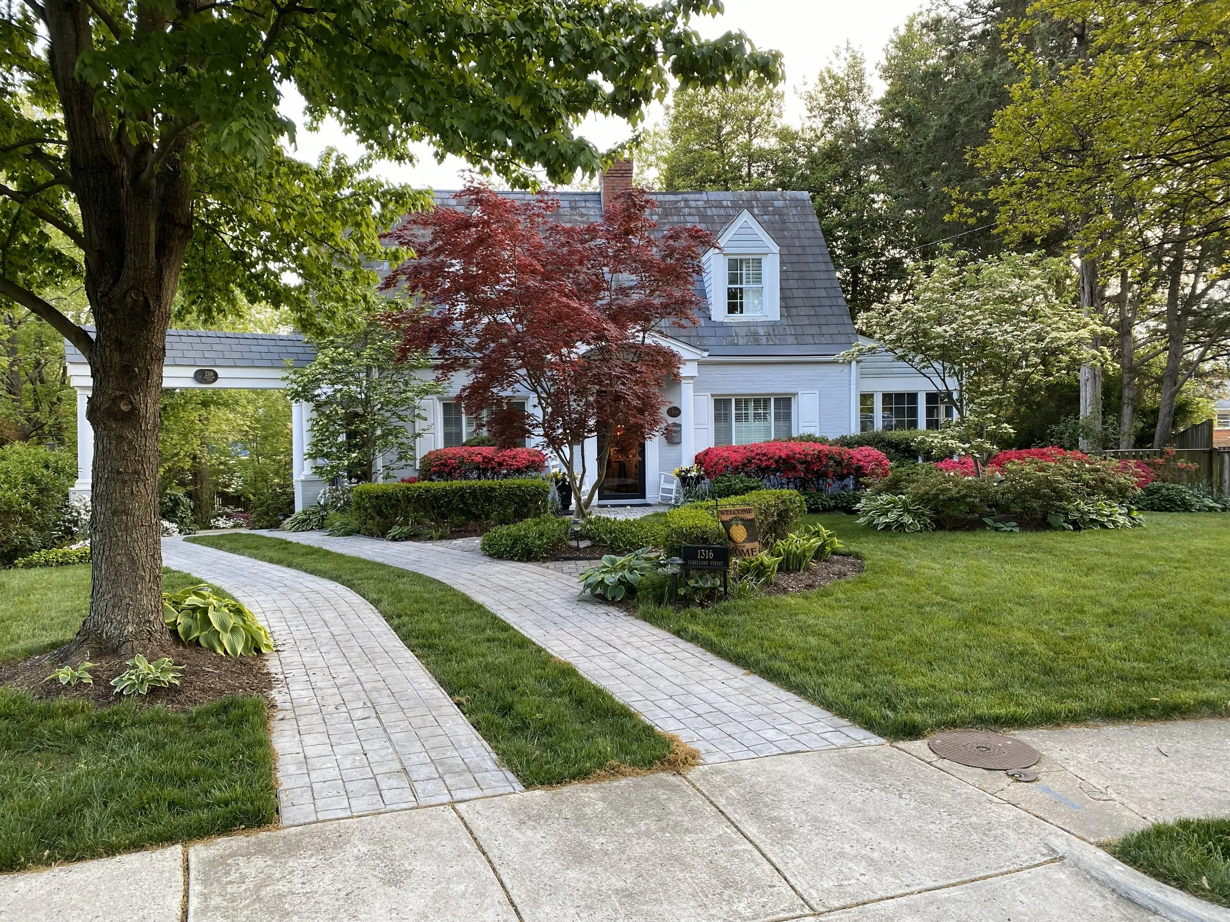 The owners of this 1960’s cottage wanted to maintain the cozy charm of the house while creating a carriage house feel. They also wanted room to park their vehicles. In the course of creating this award-winning design, we added a cobblestone-look driveway from the narrow street through a new arbor to a graded flat area large enough to park and turn maneuver their vehicles. We continued the cobblestone theme throughout, adding terraces and walkways. We were able to protect the existing mature trees, incorporating them into an otherwise completely new landscape.